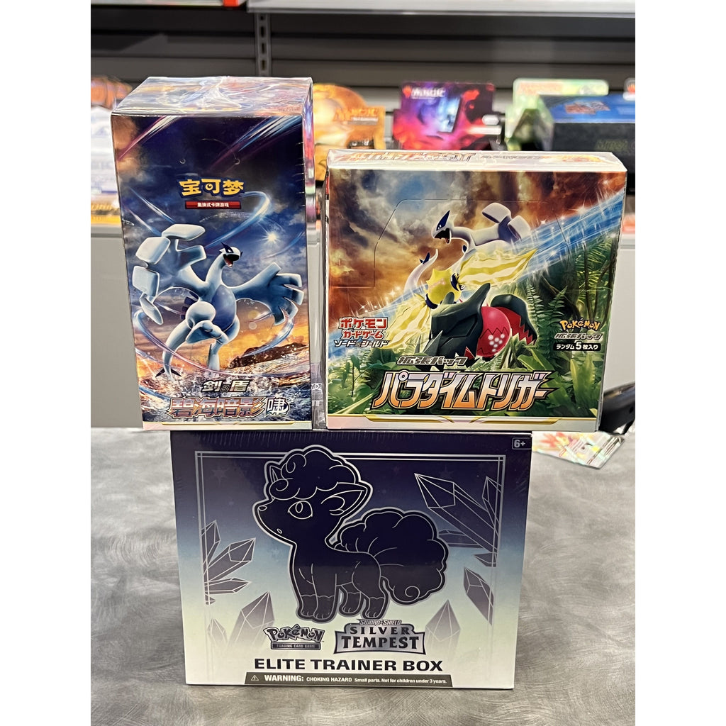 Du kjøper 1 Silver Tempest ETB, 1 Paradigm Trigger booster boks og 1 Shadows of the Blue Sea boks.